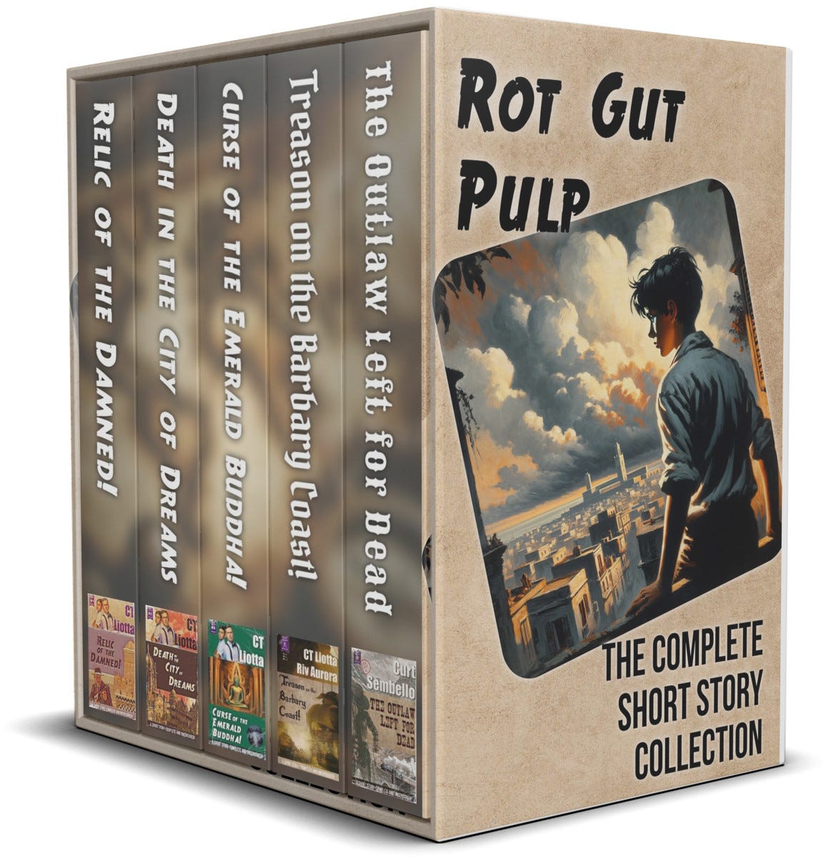 That’s right: for the same price as buying the two sequels, Death in the City of Dreams and Curse of the Emerald Buddha!, together, you can buy all five stories published by Rot Gut Pulp in one sweet box set. This set is only available for Kindle. Don’t have a Kindle? Read on!